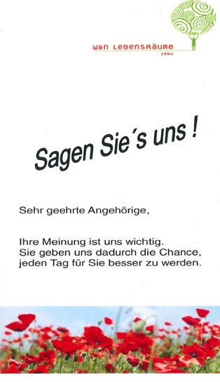 Unsere Flyer für Bewohner/innen oder Angehörige/Betreuer können Sie gern persönlich vor Ort im Qualitätsmanagement abgeben oder per E-Mail senden.